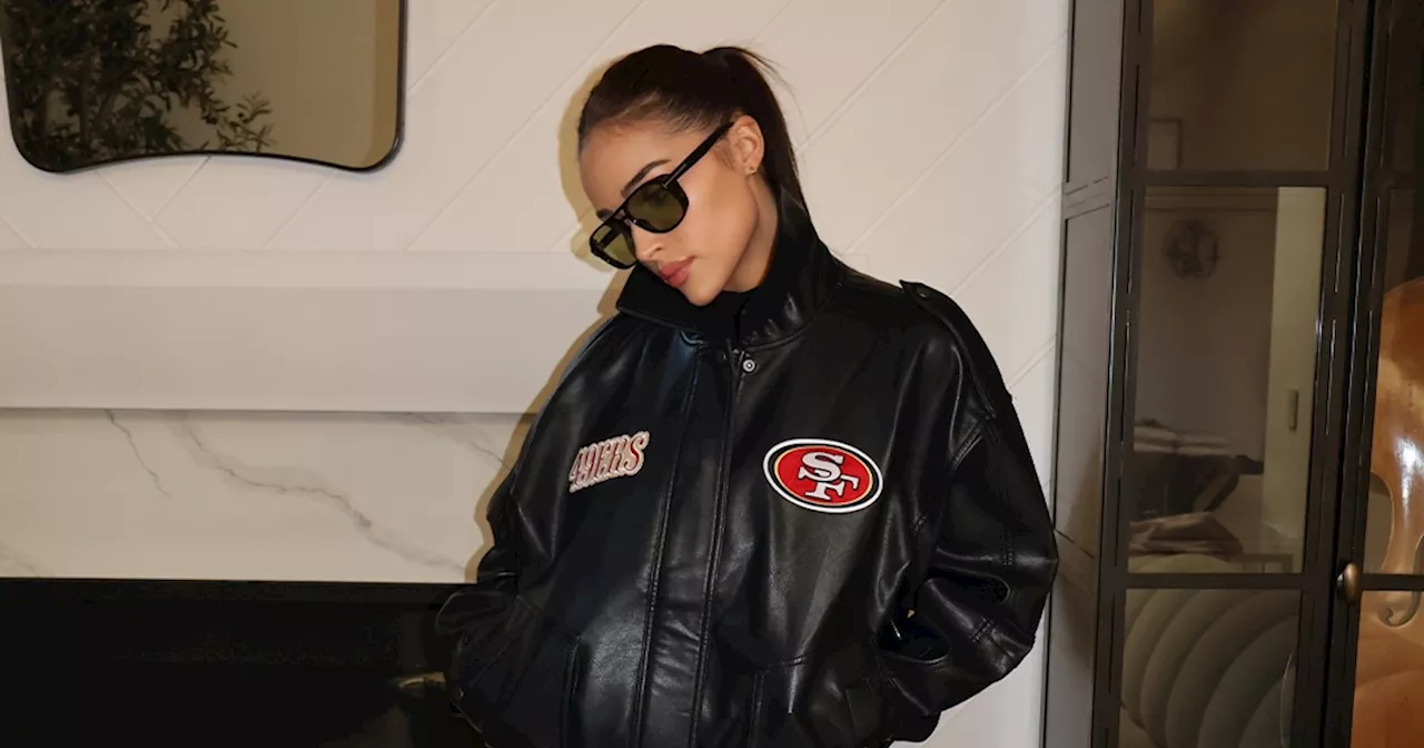 The capsule features three distinct pieces: an oversized leather jacket adorned with San Francisco 49ers embroidery, a gray crewneck sweatshirt, and a black tank top, all proudly displaying the team’s logo. “I love the neckline,” Culpo shared regarding the crewneck. “There’s just three pieces, so there’s not a ton, but I hope that people will love it as much as I do.”