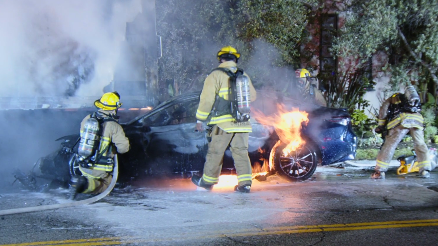 UPDATE: Two courageous bystanders rescued a woman from a burning car in Los Angeles’ Beverly Grove neighborhood early this morning. The dramatic incident unfolded around 2:30 a.m. when the woman’s blue Toyota Camry crashed into the back of a truck before bursting into flames.