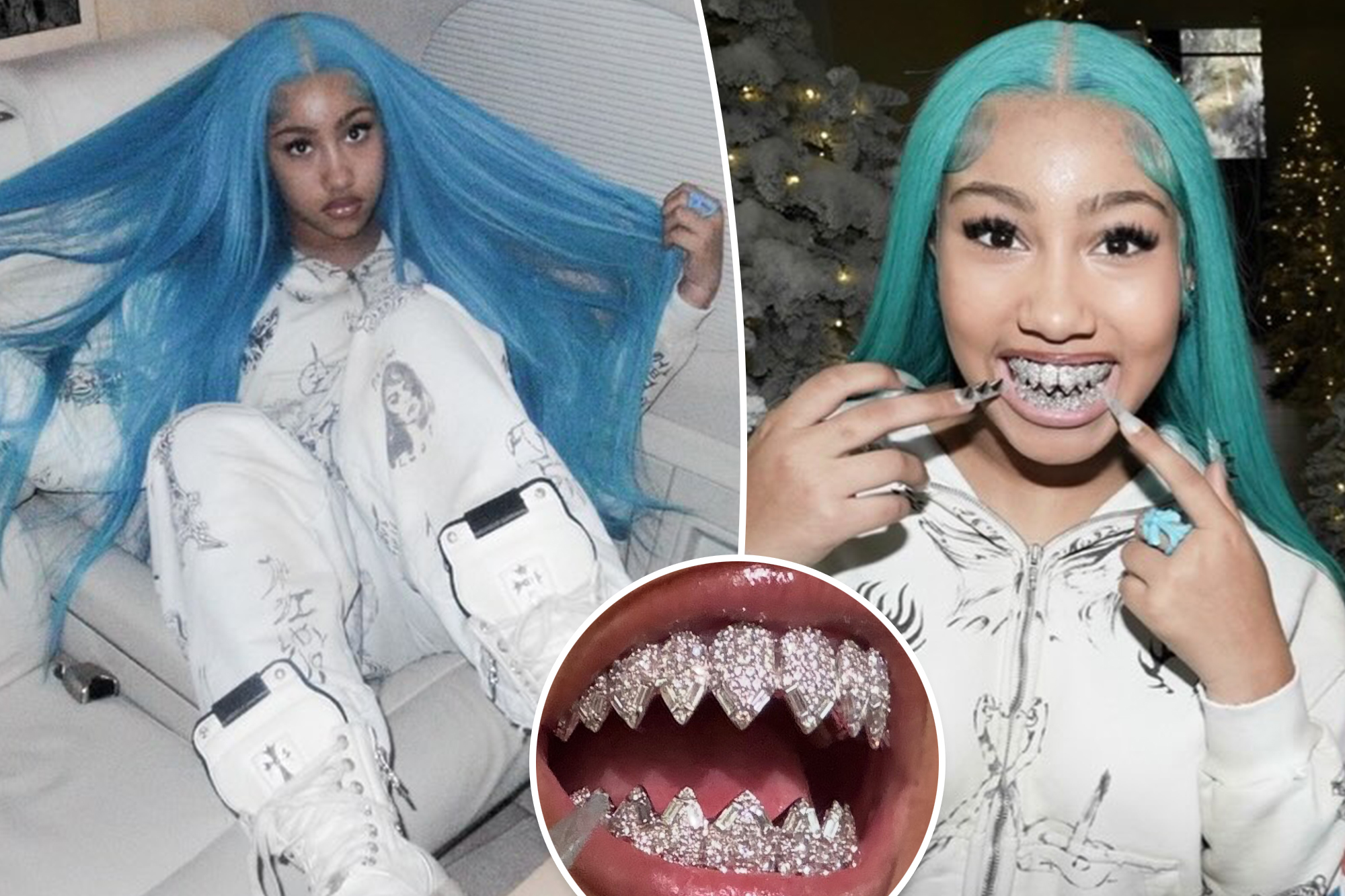In a carousel of eye-catching images, North flaunts her long, blue hair alongside the impressive grillz, designed by renowned jeweler Johnny Dang & Co.. Each tooth glistens with diamonds, crafted to resemble the sharp teeth of a shark, making this accessory a bold fashion statement. Accompanying the photos, a video on her Instagram Stories showcases this eye-catching piece of jewelry, amplifying the buzz surrounding her unique style.