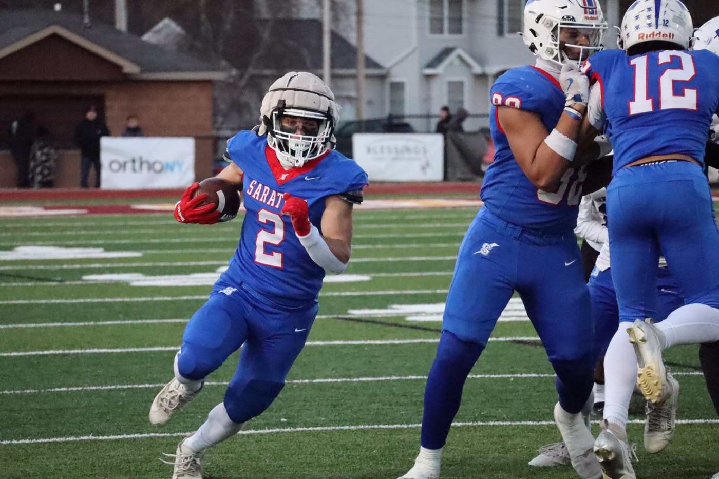 UPDATE: In a thrilling high school football matchup, the Saratoga Springs Blue Streaks have taken a commanding lead against Mamaroneck, scoring just seconds into the game. At 11:37 in the first quarter, senior running back Ben Coryea electrified the crowd with a breathtaking 64-yard rushing touchdown, quickly putting his team ahead 7-0.
