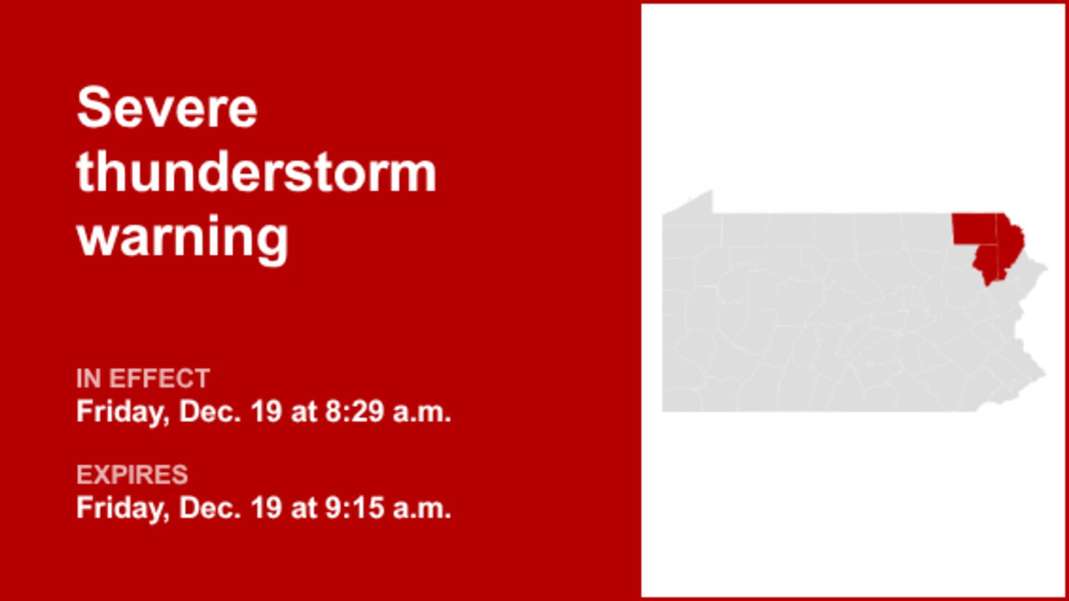 URGENT UPDATE: A severe thunderstorm warning has just been issued for parts of Northeast Pennsylvania, as damaging winds and thunderstorms are expected to impact the area this morning. The National Weather Service confirmed the warning at 8:29 a.m.> for Lackawanna, Susquehanna, and Wayne counties, lasting until 9:15 a.m.>. Residents should brace for wind gusts reaching up to 60 mph.
