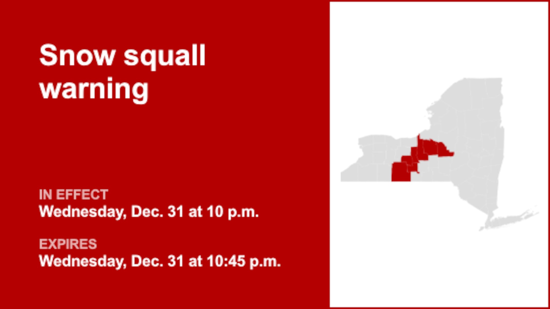 UPDATE: A snow squall warning has just been issued for several counties in New York, effective until 10:45 p.m. tonight. The National Weather Service confirmed that dangerous conditions are rapidly developing, particularly in Cayuga, Madison, Onondaga, Schuyler, Seneca, Steuben, and Yates counties.