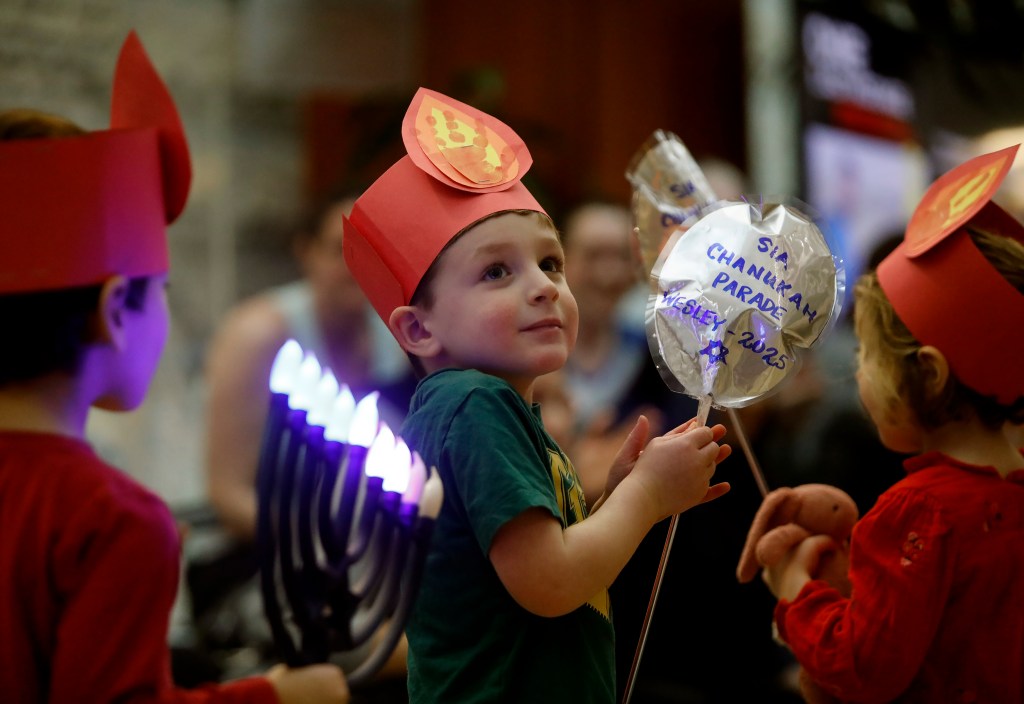 Inside the Strelitz International Academy, the atmosphere is festive, with families gathering to celebrate the holiday. Children like Guin Jung, 4, and Grayson Moll, 3, are seen dancing to traditional Hanukkah songs, illustrating the event’s strong emotional and cultural significance.